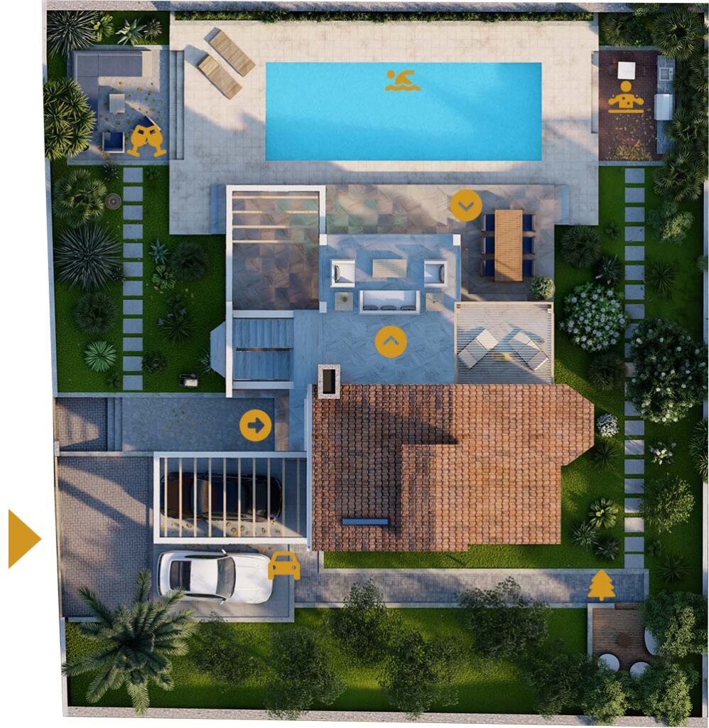 - Two water tanks, the main water tank is hidden in the landscape with size of 3x3x2m, the second water tank is inside the villa size 1x2x1m.