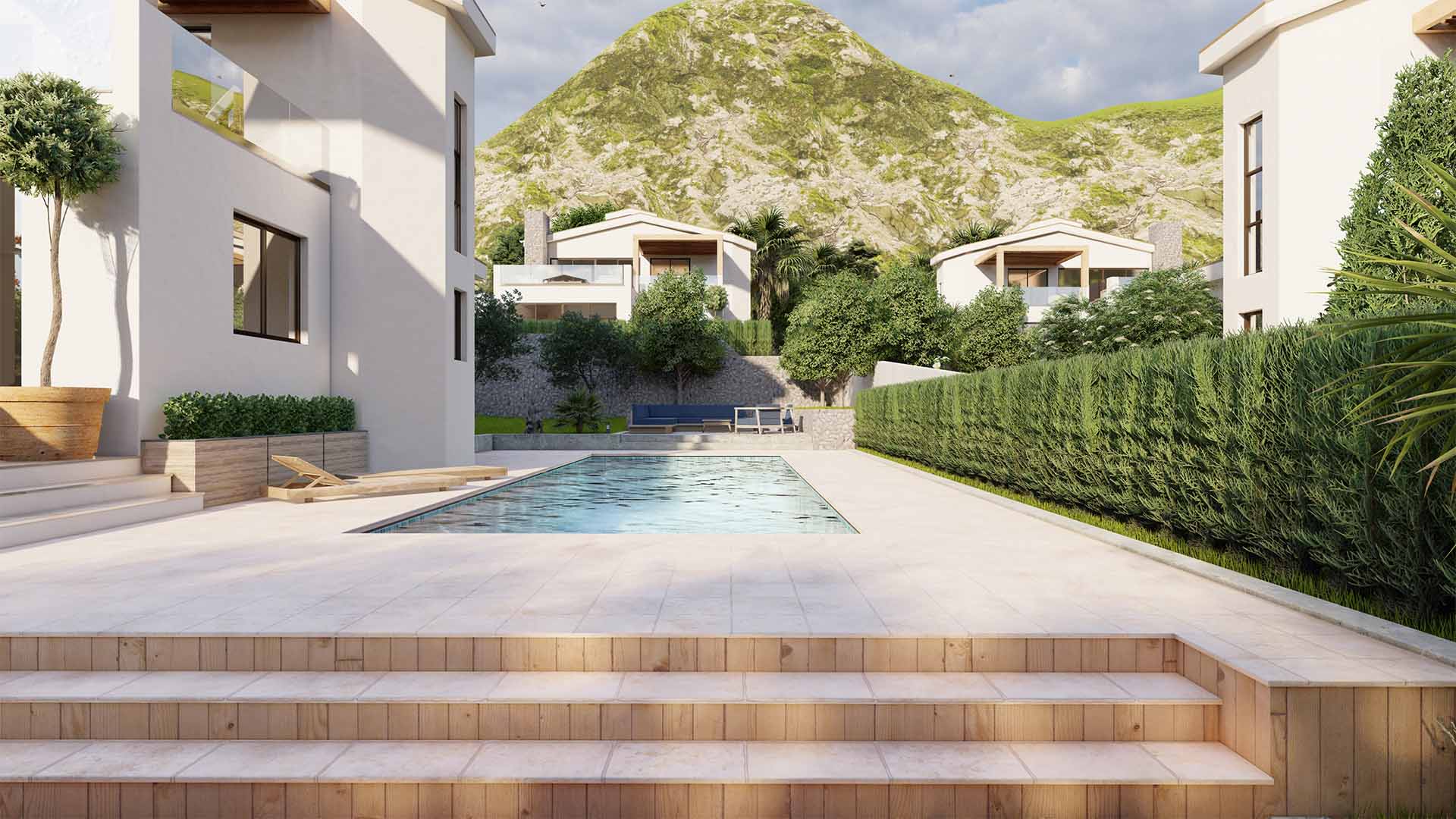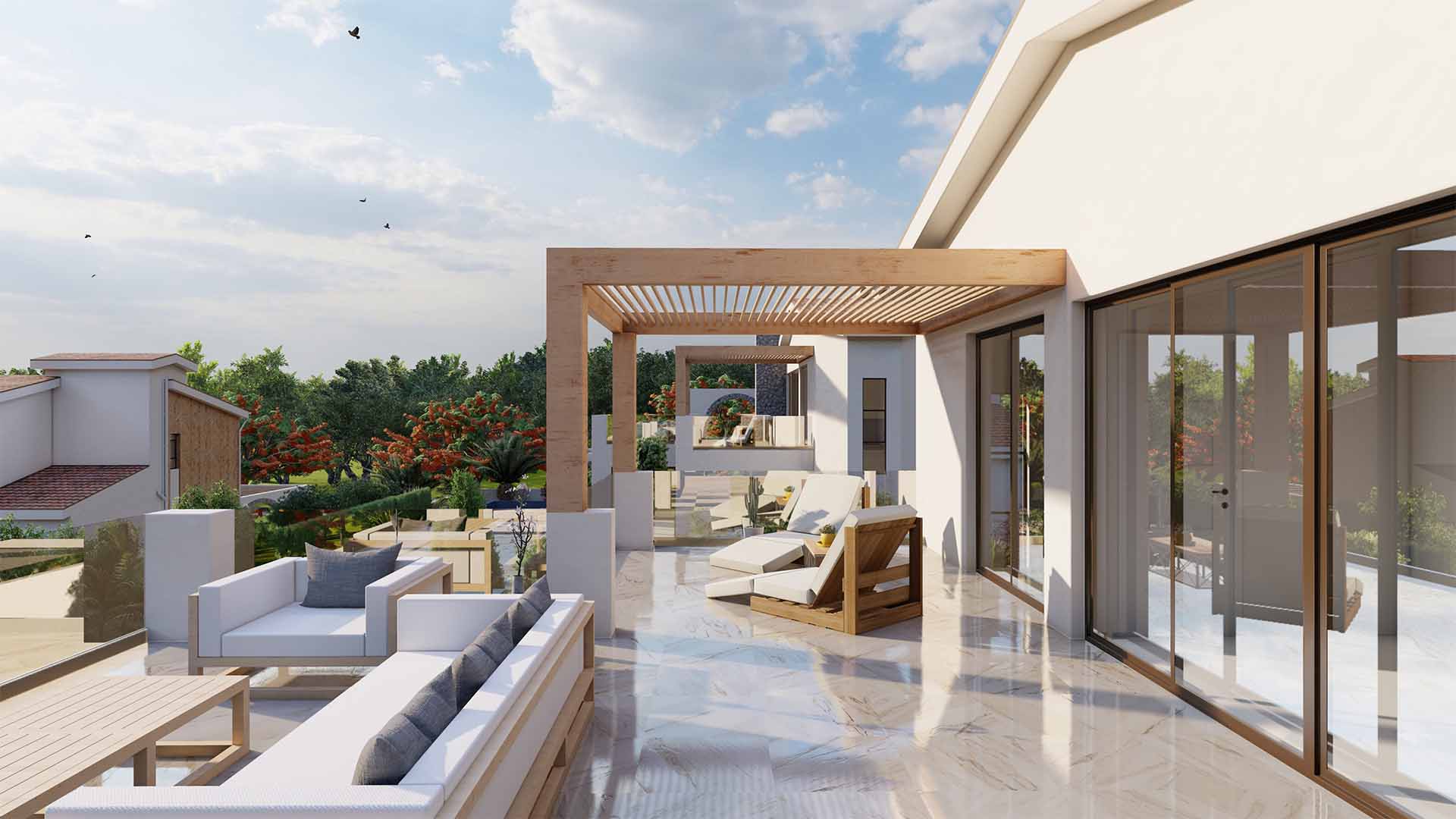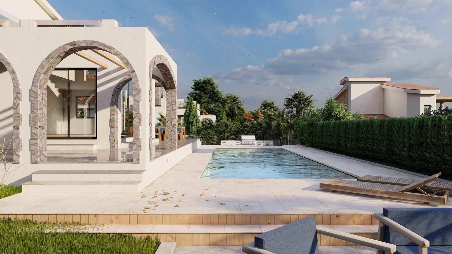 The Design concept based on authentic Cypriot architecture style with modern touches. Each one of the villas consists of 3 bedrooms, a living room, an open-plan kitchen, and 3 bathrooms. Every villa also has a large swimming pool, sitting area, barbeque area, private sitting area, double terrace, 2 carports, & an impressive landscape design.