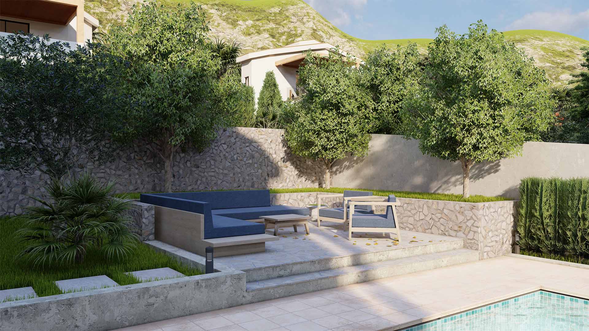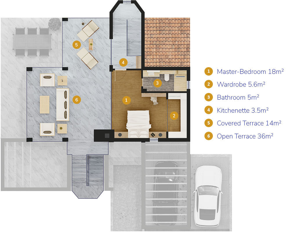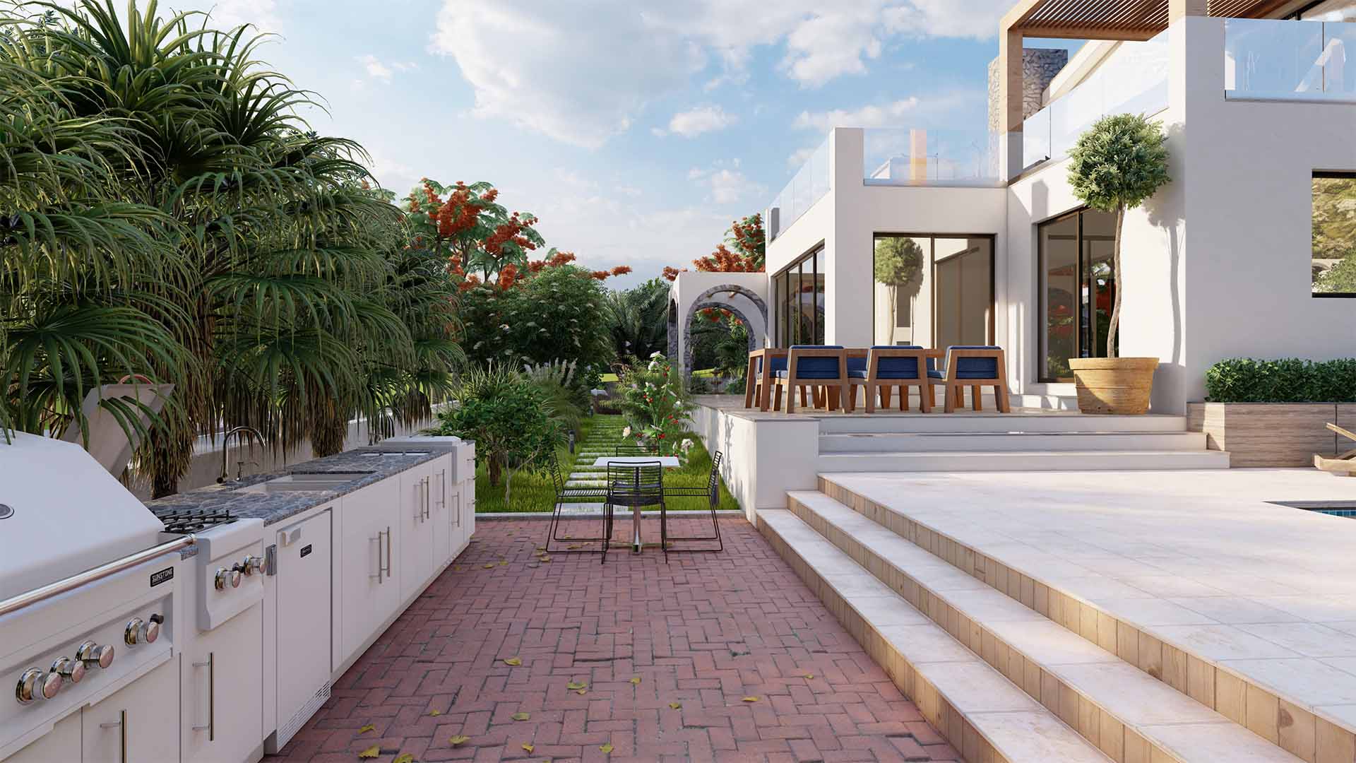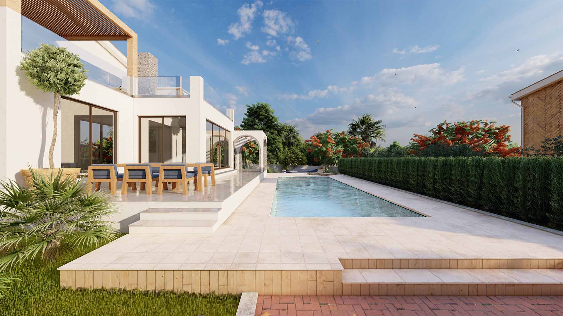 The Design concept based on authentic Cypriot architecture style with modern touches. Each one of the villas consists of 3 bedrooms, a living room, an open-plan kitchen, and 3 bathrooms. Every villa also has a large swimming pool, sitting area, barbeque area, private sitting area, double terrace, 2 carports, & an impressive landscape design.
