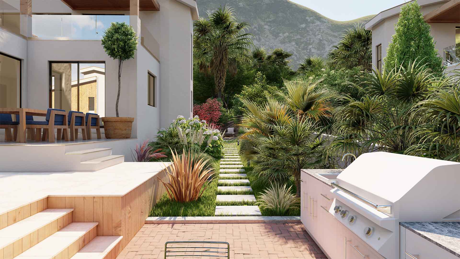- Concrete pathways consisting of 80x60x10cm laid concrete blocks, separated by landscape earth and grass.