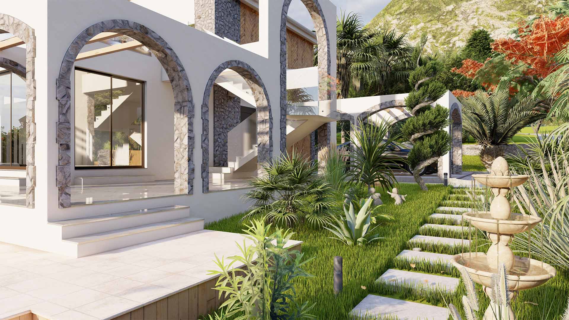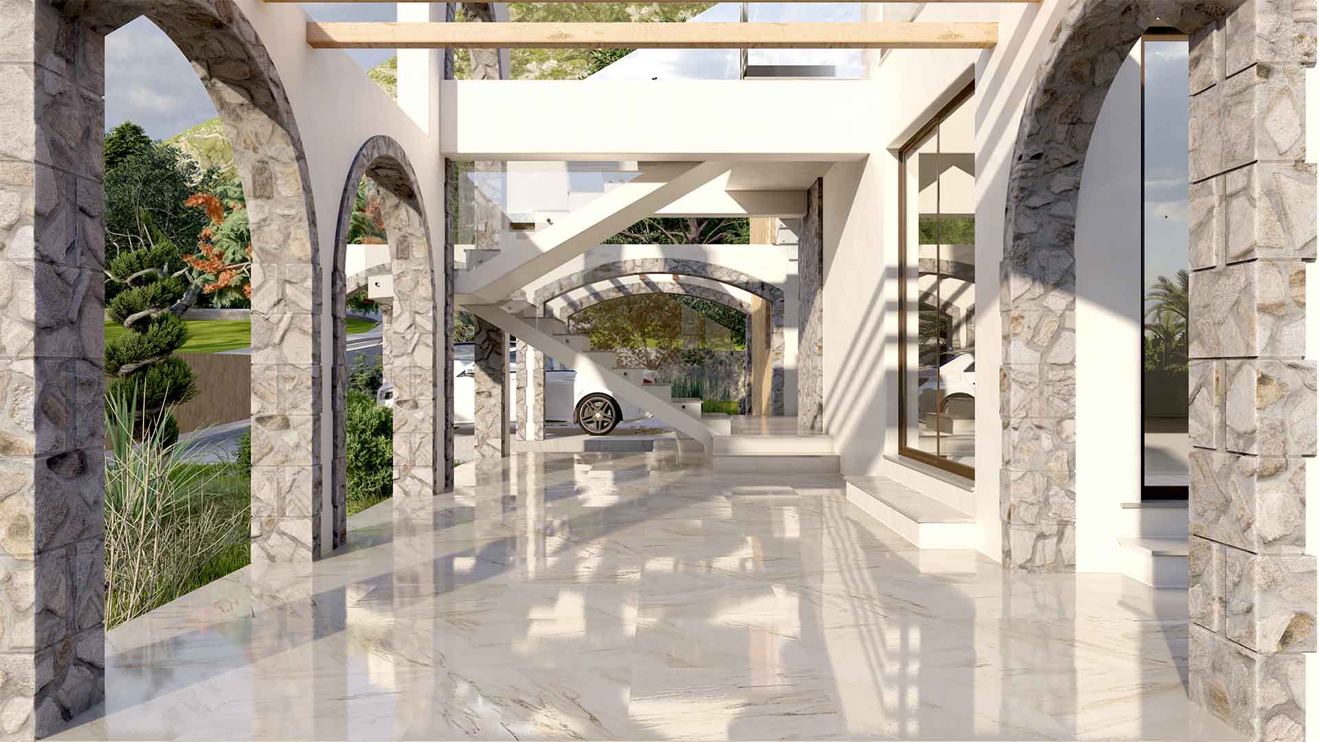 - Villas arches are covered with natural grey stone with a thickness of 3cm.