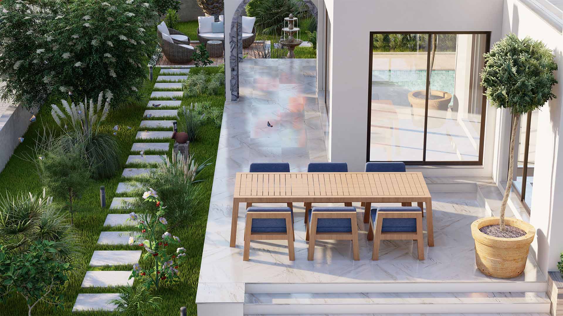 - Terraces & balconies are finished with 30x60cm high quality matte cream Travertine marble.