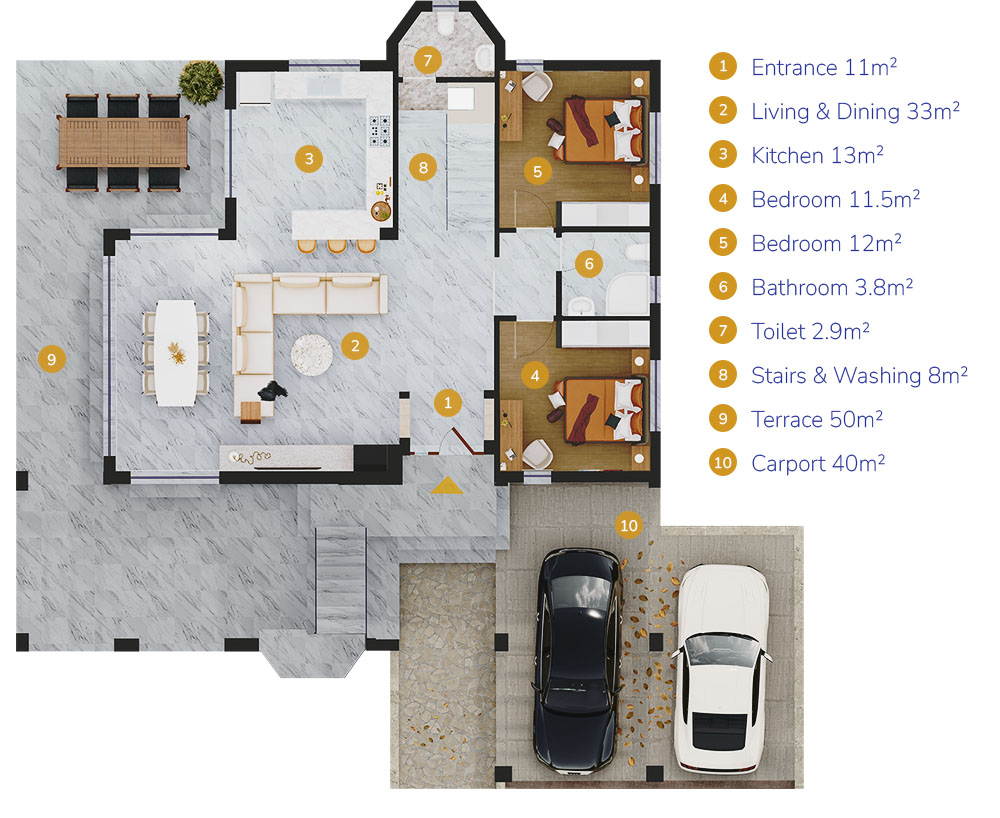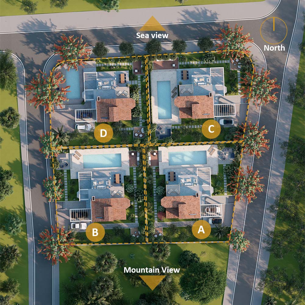 Located at Karşıyaka a home to roughly 20,000 European citizens, in Northern Cyprus. The project location is prominent, outstanding, & unmatched. It is surrounded by luxury villas, hiking trail, has full view on Karşıyaka’s football field, and has an astonishing view of the Mediterranean Sea.